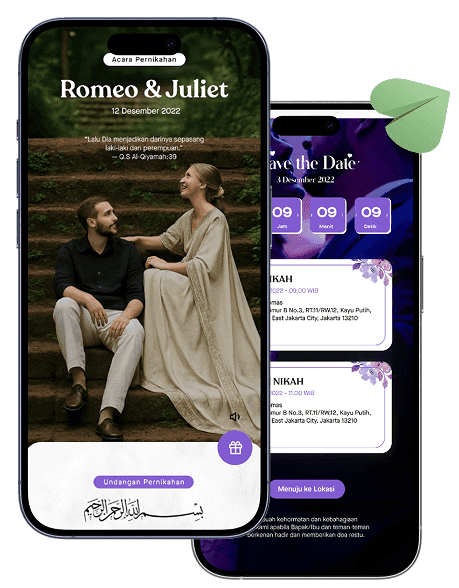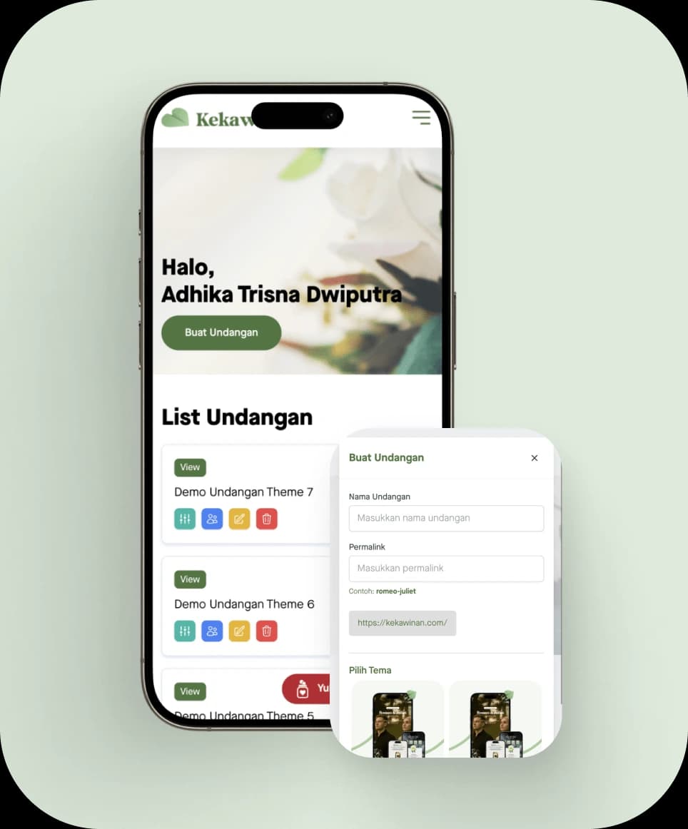 Buat website undangan nikah digital yang bisa kamu atur sendiri dari tema, foto prewed, sampai playlist favorit!